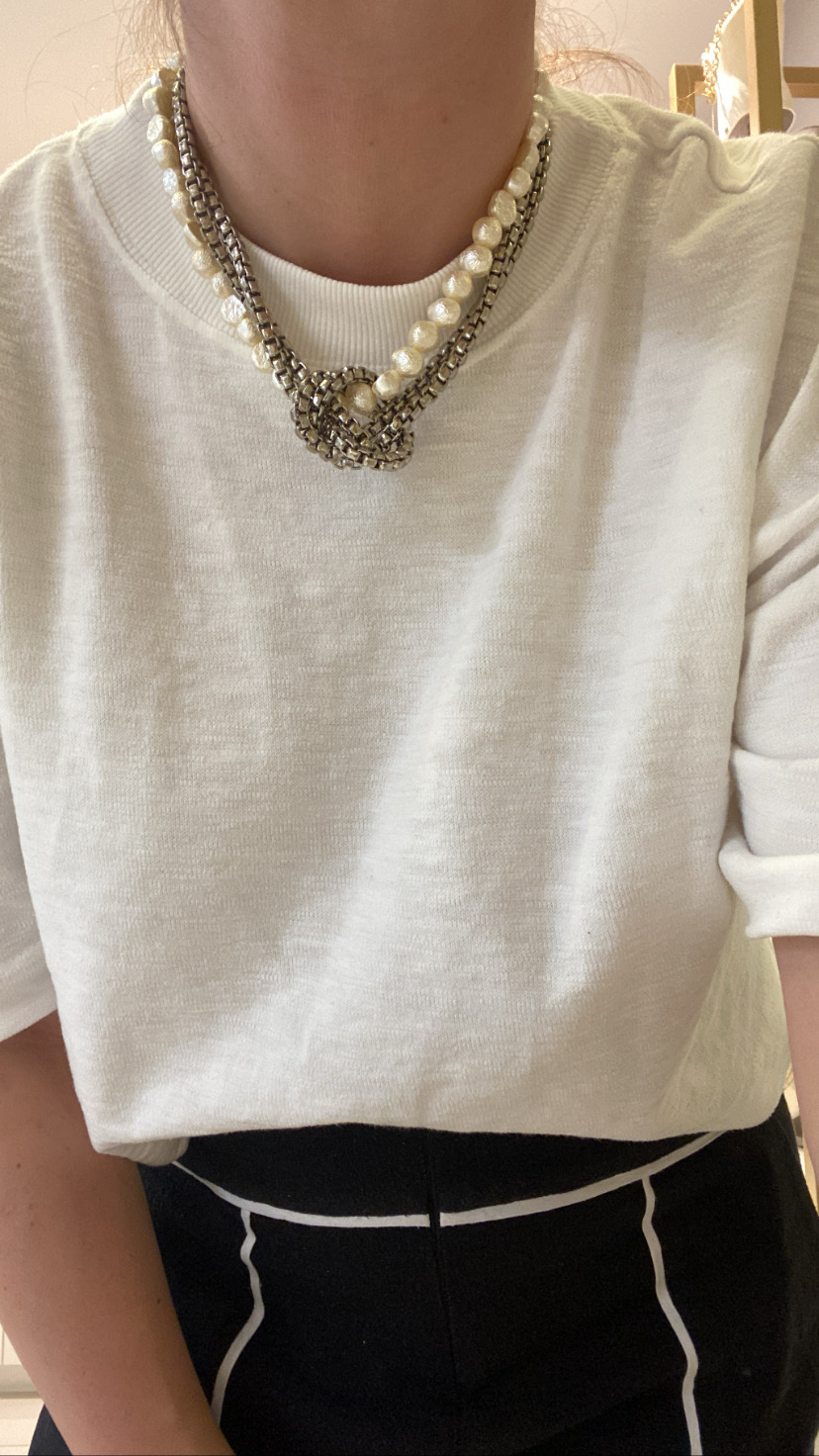 Colar em Correntaria com detalhe em pérola. O colar pérola vem com fecho individual podendo ser usado junto ou separado.